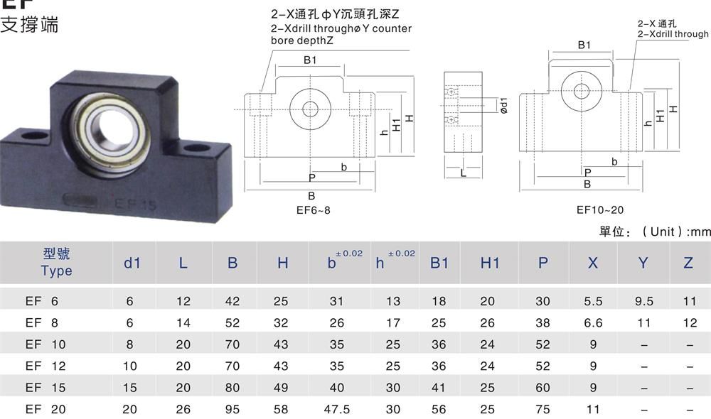 EF絲桿支撐座簡單的來講是連接絲桿和電機的軸承固定底座,是正確的標準滾珠螺桿軸端成品,同時預(yù)備了四種種標準化的支撐單元:EK型、EF型和BK型、BF型。支撐單元固定側(cè)的裝有經(jīng)過預(yù)壓調(diào)整的JIS5級的角接觸球軸承,很多都是小型的,特別是在EK6、EK8兩種超小型式中,則裝有為超小型滾珠螺桿所開發(fā)設(shè)計的接觸角45°(45度)的超小型角接觸球軸承,為了能獲得高精度、高剛性并且穩(wěn)定自如的回轉(zhuǎn)性能,同時支撐座的支撐單元也使用了深溝球軸承,支撐單元BK型、EK型的內(nèi)部軸承中裝入了適當?shù)匿囋砘鶟櫥?,不易過多,適量為止,用特殊密封墊圈進行密封,可以長期使用,也能直接安裝。