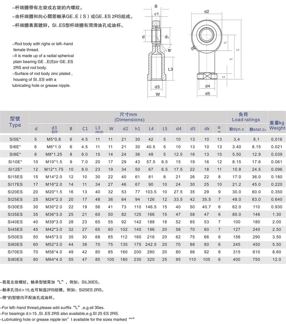 SI-E/SI-ES桿端關(guān)節(jié)軸承是一種有著特殊結(jié)構(gòu)組成的滑動式軸承,它的結(jié)構(gòu)相對比較簡單,滾動軸承要復(fù)雜一點,其主要是由一個有內(nèi)球面的外圈和一個有外球面的內(nèi)圈組成,根據(jù)其不同的類型和結(jié)構(gòu),在工作中能承受較大的負荷,也可以承受徑向負荷、軸向負荷、軸向同時存在的聯(lián)合負荷模式。