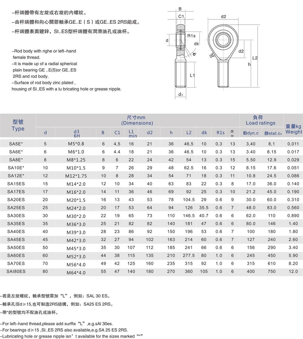 SA-E/SA-ES桿端關(guān)節(jié)軸承是關(guān)節(jié)軸承中的一個支類,是帶有裝于桿端關(guān)節(jié)軸承,關(guān)節(jié)軸承的意思就是球面滑動軸承,具有球形滑動球面接觸表面的內(nèi)、外圈組成基本型關(guān)節(jié)軸承,能承受很大的負荷,在工作中不易損壞。復合材料是鑲在內(nèi)圈的外球面上,在工作中關(guān)節(jié)軸承可以產(chǎn)生自潤滑效果,用途一般是用于速度較低的滑動運動和擺動運動,同時可以在一定角度范圍內(nèi)進行傾斜運動,自潤滑關(guān)節(jié)輔承一般應用于水利工業(yè)、專業(yè)機械等行業(yè)領(lǐng)域,軸殼孔和支撐軸其心度較大時,依然可以進行正常工作,為什么會這樣,因為關(guān)節(jié)軸承傾斜角度大,其球形滑動時,接觸面積也大,所以大多數(shù)關(guān)節(jié)軸承運用了特殊的工藝處理方法,好應用于一些重要場合。