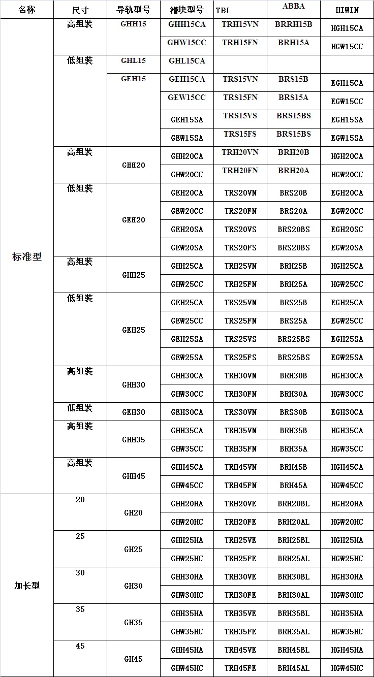 GE系列分為非互換性及互換性型兩種線性滑軌,兩者規格尺寸相同,主要差異點在于互換性型之滑塊、滑軌可單獨互換使用,較便利,但其組合精度無法達到非互換性型之超精密級以上的精度,不過由于互換性型之組合精度目前已達到一定的水平,對不需配對安裝線性滑軌的客戶而言,是一項便利的選擇。GE線性滑軌的產品規格型號主要標明線性滑軌尺寸、型式、精度等級、預壓等規格要求,以利訂貨時雙方對產品的確認。