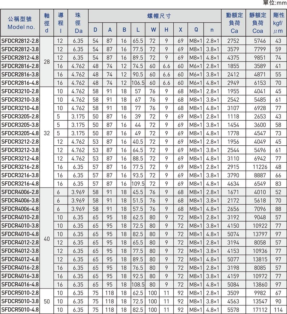 SFDC是滾珠螺桿中的一種型號,滾珠螺桿英文名Ballscrew,別名又叫球螺桿、導螺桿,是一種摩擦性小的鋼珠介于螺帽與螺桿之間反復做運動,將傳統螺桿之滑動接觸轉換成滾動接觸,然后再將螺帽內的鋼珠的回轉運動轉為直線運動的傳動機械組件。滾珠螺桿具有定位低污染、精度高、高壽命和可做高速正逆向的傳動及變換傳動等特性,在機械領域具有重要作用;根據上述特性,滾珠螺桿已成為近來精密科技產業及精密機械產業以及相關行業的定位及測量系統上的重要零組件之一。